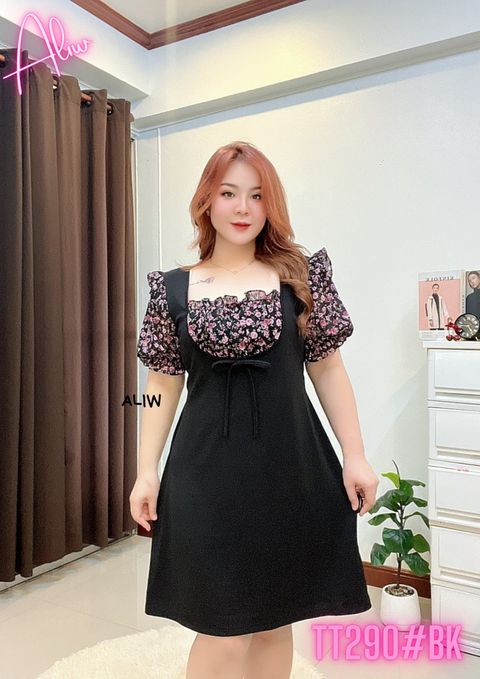 PLUS SIZE DRESS|FLORAL SLEEVE SLIMMING DRESS #TT313#BK #花袖拼接修身连身裙